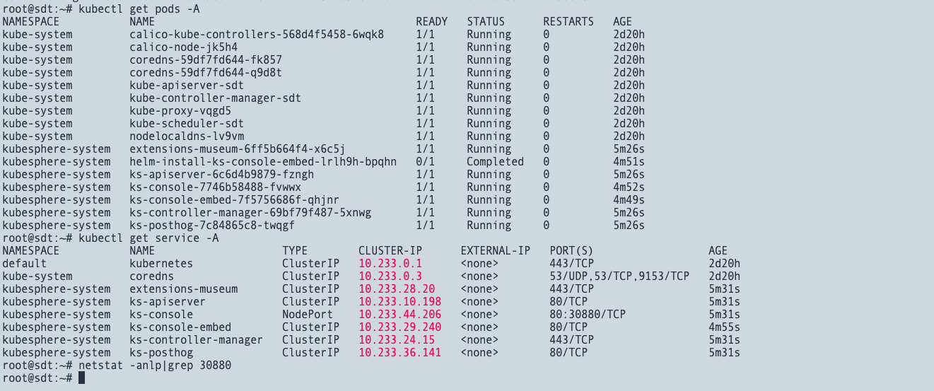 wx24736 Kubernetes版本信息 单节点,1.28.3 容器运行时 containerd,版本1.7.13 KubeSphere版本信息 v4.2.0 在线安装,安装显示已经完成 问题: 安装完成后访问 kubesphere 控制台地址无响应,服务器上查看端口没有被监听,查看 pod 与 svc 都是正常的