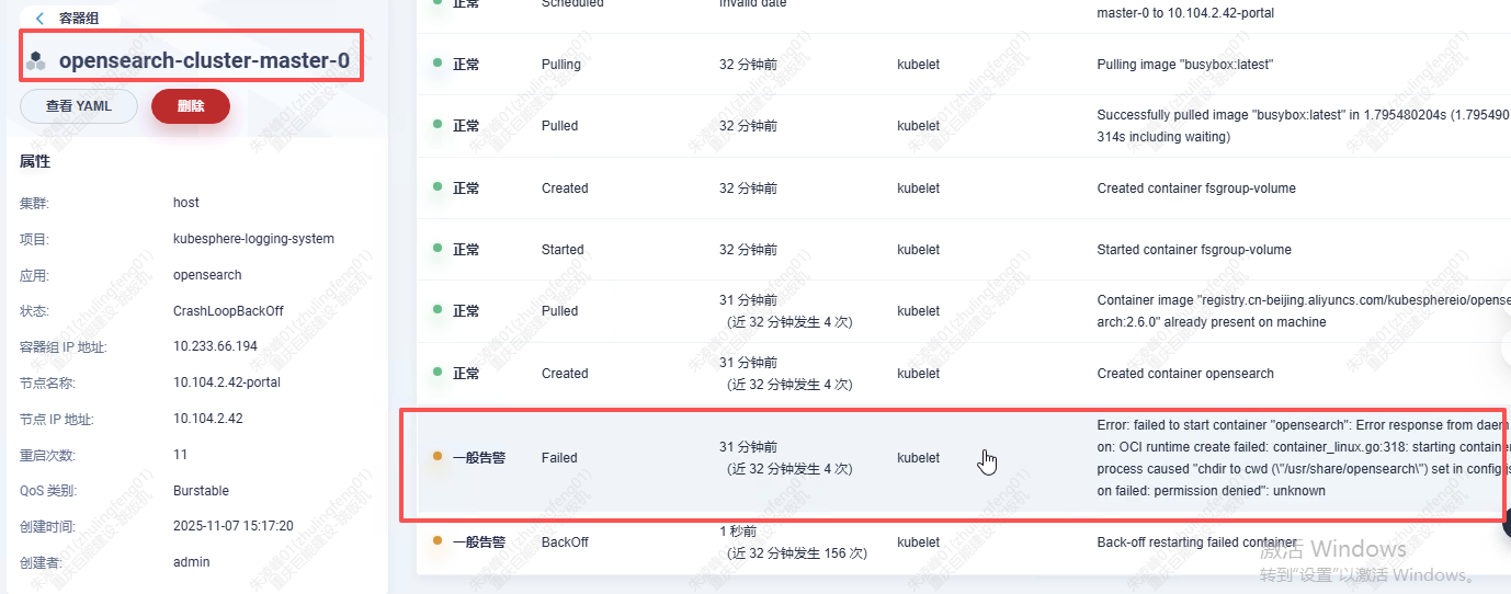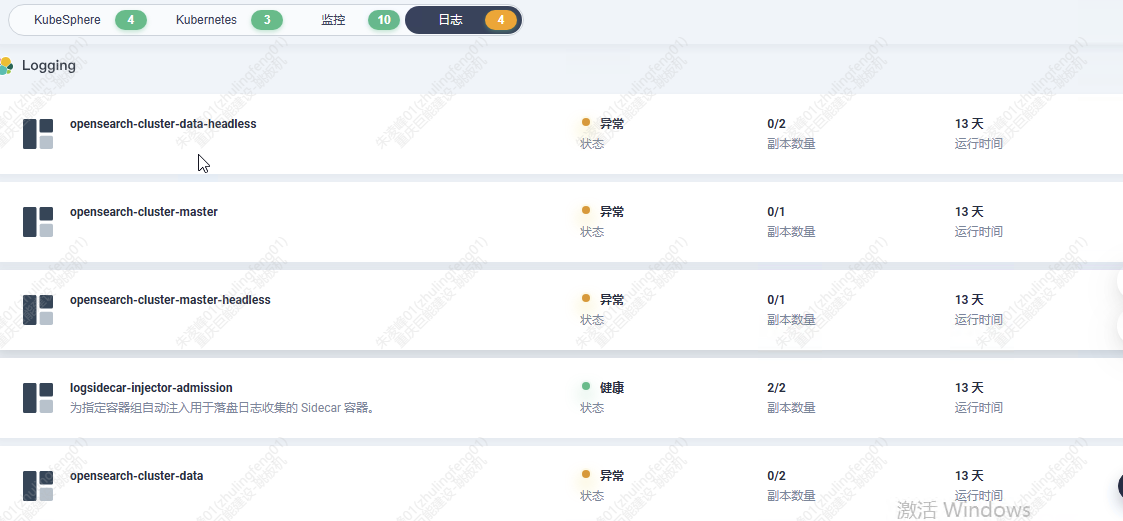 在已经安装好的KubeSphere情况下,启动日志组件,报错