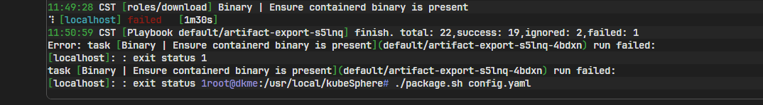 ywsk 操作系统信息 例如:物理机,Ubuntu22.04 Kubernetes版本信息 将 kubectl version 命令执行结果贴在下方 ./package.sh config.yaml KubeSphere版本信息 离线制作安装包。 问题是什么 执行这个./package.sh config.yaml报错