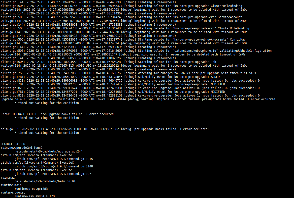 upgrade.go:487: 2026-02-13 11:45:29.075473707 +0000 UTC m=+318.433048444 [debug] warning: Upgrade “ks-core” failed: pre-upgrade hooks failed: 1 error occurred: